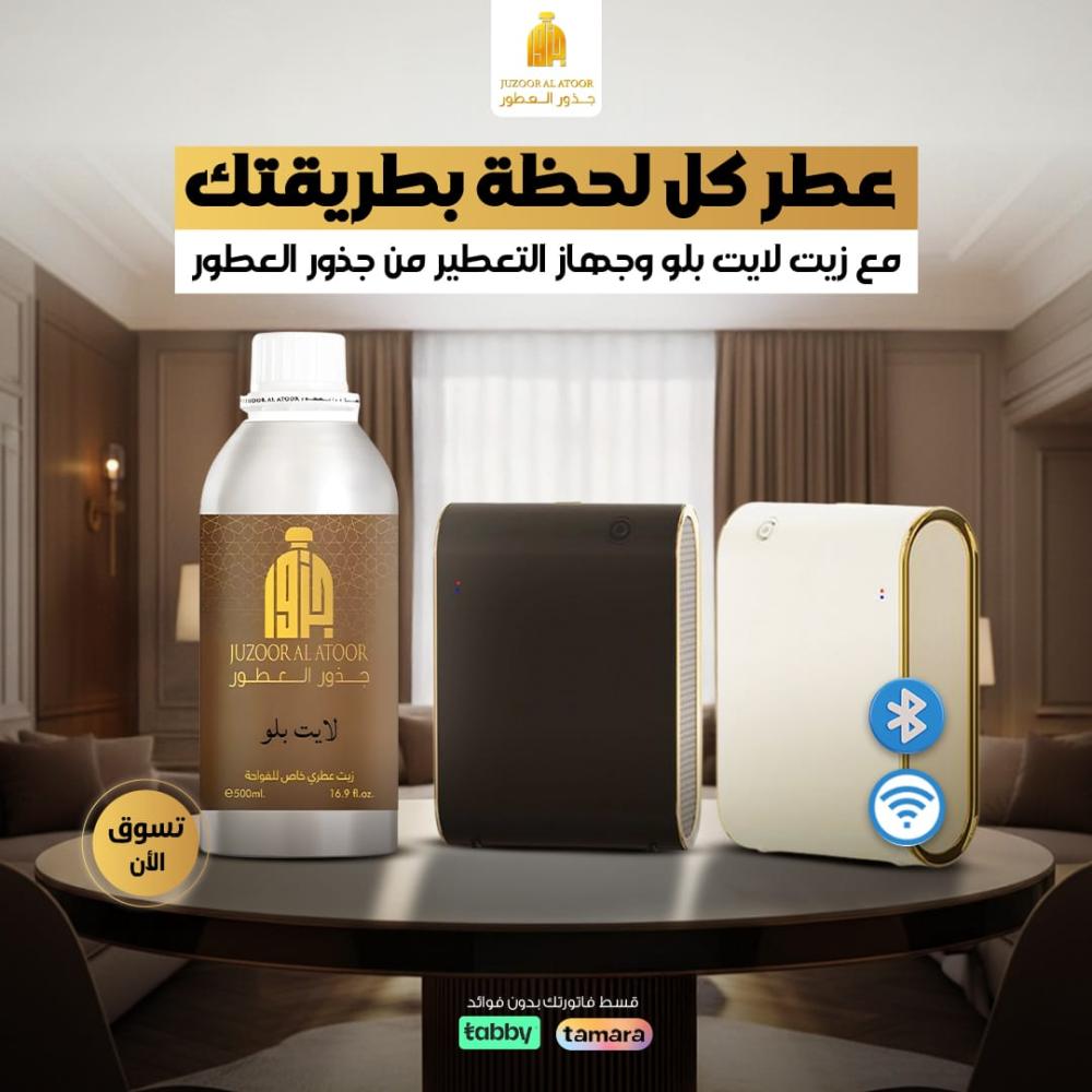 جهاز تعطير ذكي للشقق والفلل – مع زيت عطري لايت بلو 500 مل احصل على تجربة تعطير فاخرة ومتكاملة مع جهاز التعطير الذكي من جذور العطور، المصمم لتغطية المساحات الواسعة مثل الشقق والفلل، ويأتيك مع زيت عطري برائحة لايت بلو (500 مل) لانتعاش يدوم.